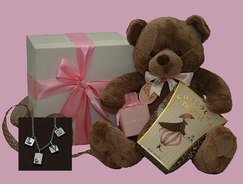 'Simply Said', our 10" sitting Valentine plush, bears the gift of romance in four sterling silver dangling letters L- O- V -E beautifully handcrafted by Judy Vilmain on a sterling silver 9" chain . Love letters are the most classic and timeless expressions of your feelings; wearing them will be her most cherished piece of jewelry. Embraced in the arms of Simply Said' is a 1.2 oz. box of heavenly chocolate truffles to sweeten the words of your undying love! The Love Letters and Truffles Valentine's Day gift comes in a white box wrapped with a beautiful bow. Includes the matching GiftProse card and prose (or write your own sentiment).
