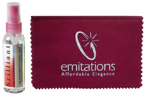 Our Emitations.com Jewelry polishing cloth and a 2 oz. bottle of Brilliant Restorer Jewelry Cleaner sent together for your convenience... and savings!Jewelry Polishing Cloth cleans, shines and protects Gold, Silver and Platinum! Rub surface gently with inner treated jewelry cloth to loosen tarnish. Buff surface with outer jewelry cloth to instantly obtain a brilliant shine. This polishing cloth works great on gold, silver, and platinum.Brilliant Restorer is the only jewelry cleaner with a manufacturer's money back guarantee! It is recommended by the Jewelry Information Center and was used in 2005 Academy Award gift bags by the Diamond Information Center. Each bottle contains a decorative pink CZ stone.Instructions for Brilliant Jewelry Cleaner: 1. Remove jewelry. 2. Spray onto jewelry. 3. Wait for 10 to 60 seconds. Do not allow Brilliant to dry. 4. Rinse thoroughly for 10 seconds in water. 5. Allow jewelry to air dry. Use "canned air" (normally used to clean computer keyboards) for best results. Note: when using canned air, do not shake or tilt can. The propellant can coat jewelry. Propellant can be easily cleaned off with Brilliant. 6. Very dirty jewelry may require light brushing, and/or a second application.Brilliant works very well on water resistant watches. Use good water resistance techniques. After rinsing, canned air also works well on metal watchbands. Brilliant is safe and recommended for most gemstones, including tanzanite. Brilliant instantaneously removes hard water deposits. Spray, rinse and air dry. Brilliant's pH is equal to that of citrus fruits, and should be used regularly. Precautions Brilliant should not be used on porous stones. Caution should be used on oil impregnated stones such as emeralds. It is recommended that only jewelers use Brilliant on emeralds. Do not use on antiqued or black oxidized jewelry, such as class rings.Use Brilliant in a well ventilated area. It is best to spray Brilliant into a sink area. Rinse off over-spray. Brill...