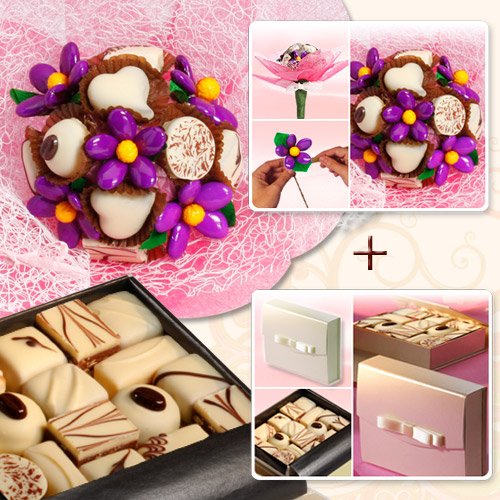 - 1 Hand-made Chocolate Bouquet composed of 5 Edible Chocolate Dragee Flowers & 8 fine Chocolates.