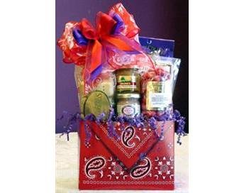 This Red Hat Bandana Gourmet Gift Box by Sweet Gift Express comes with a wide assortment of delicious foods from Wisconsin. The gift box has a red bandana design with purple or red crinkle fill. The bow is hand made from top quality fabric wired red and purple ribbons making this a perfect gift for any Red Hat occasion.