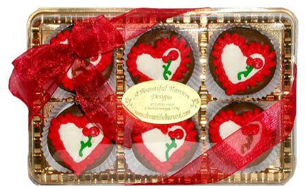 Weve taken a childhood favorite and given it twist! We hand dip each Oreo cookie one by one into your choice of scrumptiously creamy Callebaut White, Milk or Dark Belgian Chocolate and top it with a sugar heart decorated with a rose. Once each cookie is finished we place them in a lovely gold box with cookie insert, then hand tie the box with ribbon, add a handmade bow & accent that reflects your gift-giving occasion. So go onwhat are you waiting fortreat the love of your life, your husband, wife, girlfriend, boyfriend, or any other special person in your life to a box of these decadent cookies! Theyll make wonderfully inexpensive gift that shows you care to send them the very best this Valentines Day.