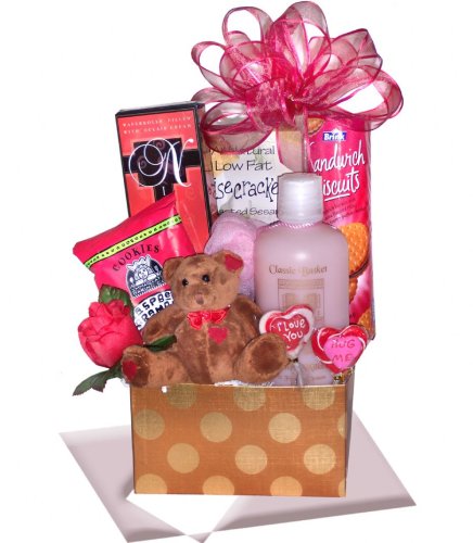 Looking for unique valentine gifts for your special girl? WFGB has the answer with our original Teddy Bear Gal presentation. Be mine couldn't be said any better than with a soft cuddly collectable bear to hug and hold. She will love the soothing lotions and delectable chocolates and marvelous treats. Featured items: Raspberry chocolate cookies, love teddy bear, candy heart confections, crackers, luxurious foaming milk bath and more. Select unique valentine gifts that send your message in the grandest way from World Famous Gift Baskets. Approx. number of basket contents: 10-11. Approx. overall product dimension: 11L x 6W x 18H inches. Note: The gift basket design shown is typical. Due to supply and demand, however, gift basket design and any contents may vary with each purchase