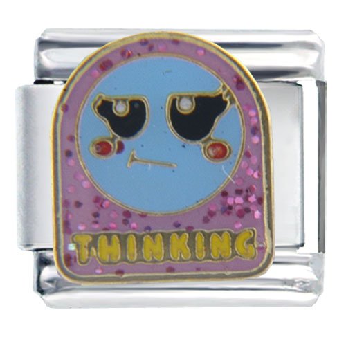 This Italian charm features a glittery pale pink base with a blue thinking face and the word Thinking in yellow bubble letters. Crafted and authenticated by Pugster Inc.