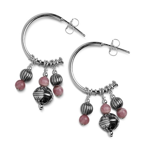A sterling silver hoop is flirtatiously decorated with silver flower stamped beads, corrugated silver beads and pink rhodonite beads. A must have for any age! Carefully handcrafted, earrings have sterling posts and butterfly clutches. Measure 1 1/2 inches L x 3/4 inch W. Handcrafted in New Mexico, USA.