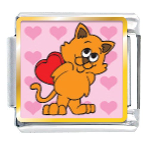 Show off your personality, hobbies, or significant affiliations with this Pugster Cat with Valentine Italian charm. This photo charm features a shy orange cat, standing over a pink backdrop ornamented with hearts, as he hides a big red Valentine behind his back. Crafted of the finest stainless steel with a soldered face (as opposed to less durable glue), this photo charm is sure to be a hit as you build your Italian charm bracelet or anklet. You can build your bracelet all at once, or gradually over the years. Either way, these bracelets are a great way to express your enduring values and style. Also a great Valentine's Day gift for friends and family. Crafted and authenticated by Pugster (TM) Inc., this Cat with Valentine photo charm is available for both retail and wholesale purchase in our store and is compatible with charms from all major brands.