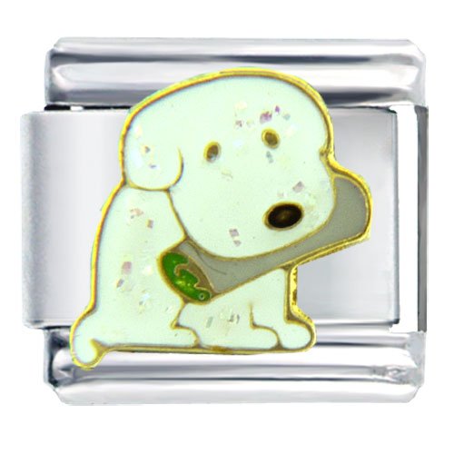 Nothing makes life seem so special as a cute animal, and the little white dog, whose brought in the morning paper, on this Puppy with Newspaper Italian charm is one of the cutest you will ever see. Whether you will be using this charm to add to your own Italian charm bracelet or anklet, or want to give it as a gift to an animal loving friend or family member, you surely cannot go wrong with something this adorable. The enamel design of the charm's face is soldered onto the stainless steel base of this durable link. Crafted and authenticated by Pugster (TM) Inc., these Puppy with Newspaper Italian charms are available for both wholesale and retail purchase from our store and are compatible with charms from all major brands.